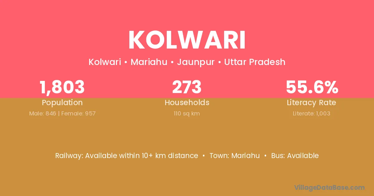Kolwari village has a total population of 1,803 people, of which 846 are males and 957 are females.