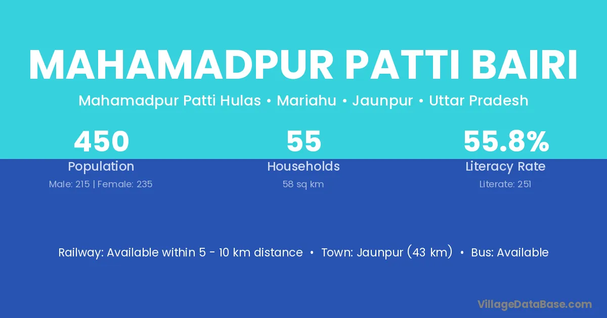 Jaunpur (43 km) is the nearest town to Mahamadpur Patti Bairi village for major economic activities and is located approximately 43 km away.