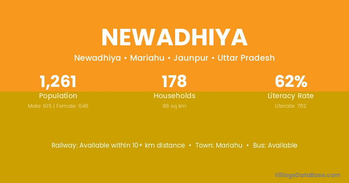 Newadhiya village has a total population of 1,261 people, of which 615 are males and 646 are females.