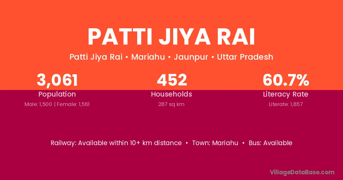 Patti Jiya Rai village has a total population of 3,061 people, of which 1,500 are males and 1,561 are females.