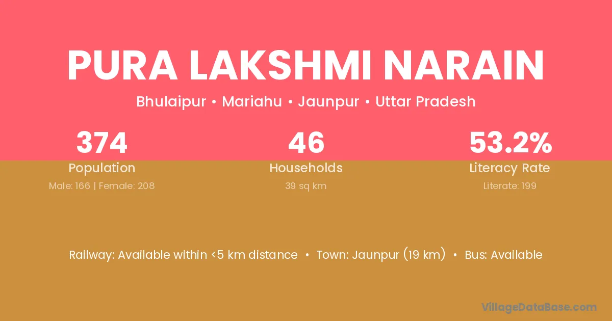 Jaunpur (19 km) is the nearest town to Pura Lakshmi Narain village for major economic activities and is located approximately 19 km away.