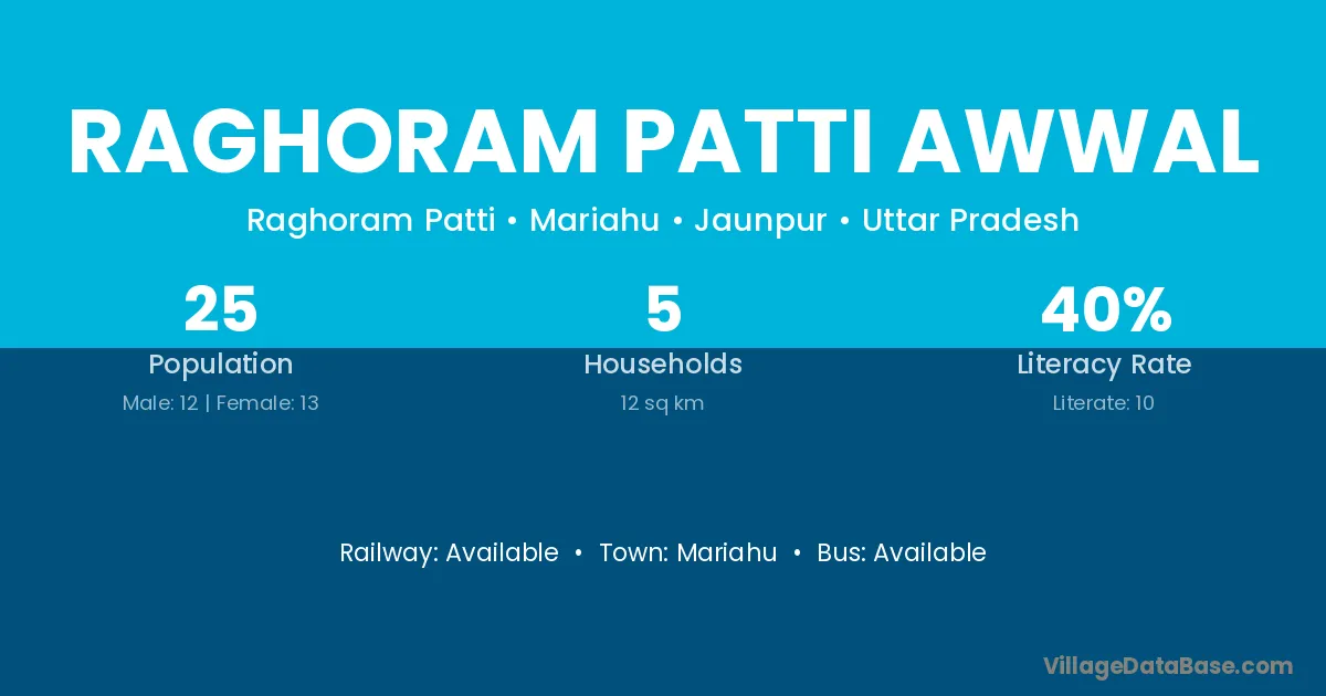 Raghoram Patti Awwal village has a total population of 25 people, of which 12 are males and 13 are females.