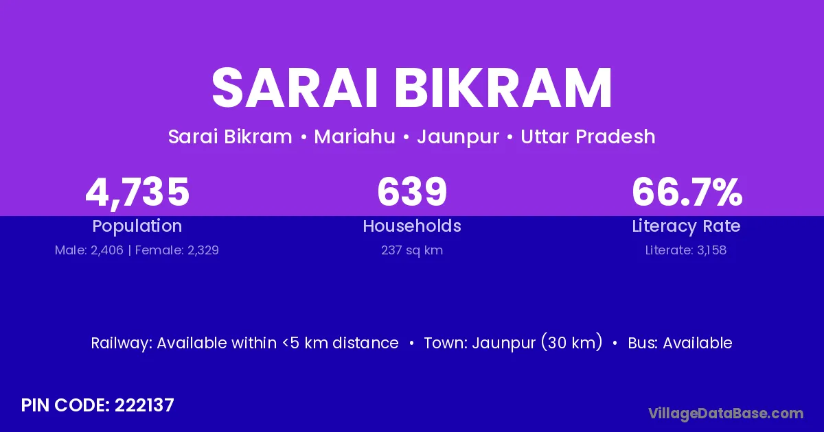 Jaunpur (30 km) is the nearest town to Sarai Bikram village for major economic activities and is located approximately 30 km away.