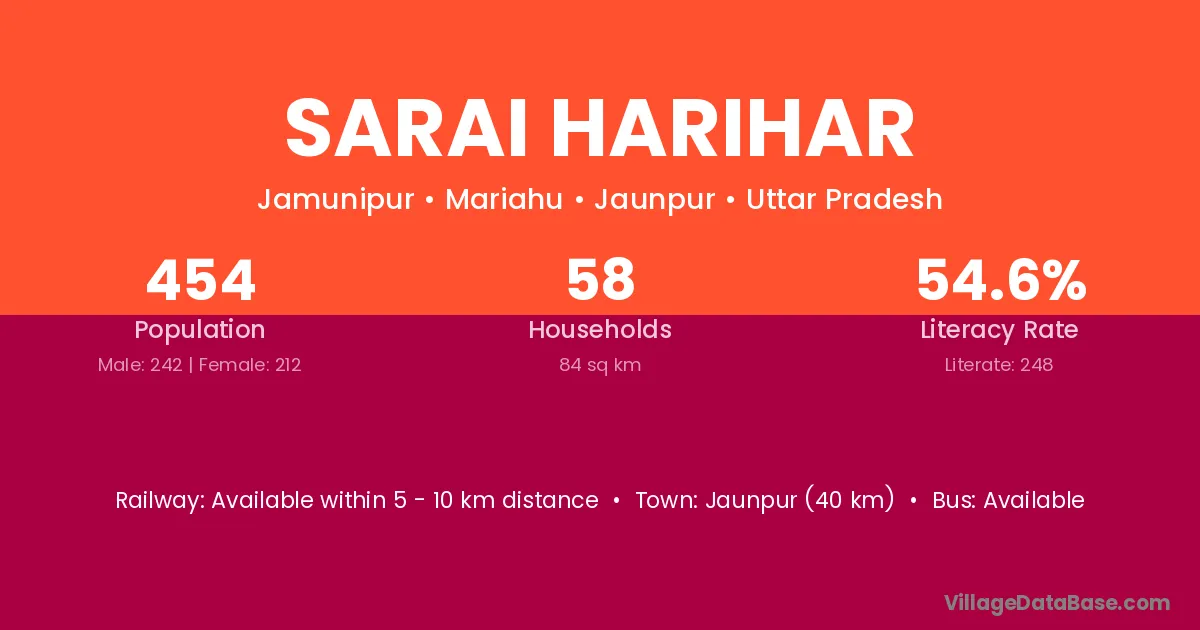 Jaunpur (40 km) is the nearest town to Sarai Harihar village for major economic activities and is located approximately 40 km away.