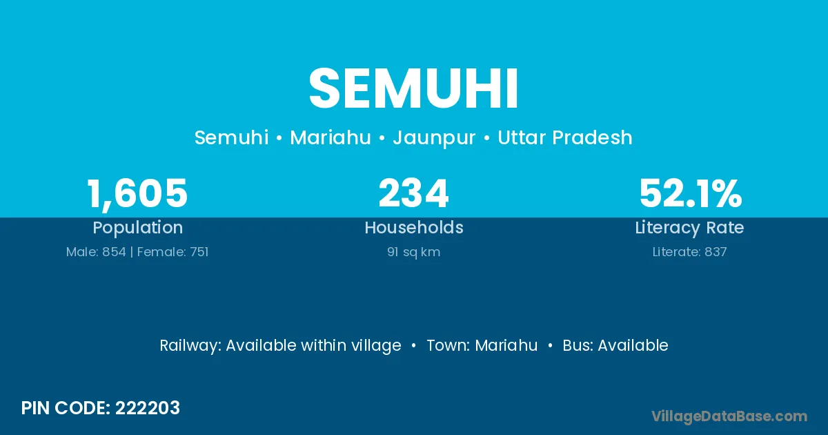 Semuhi village has a total population of 1,605 people, of which 854 are males and 751 are females.