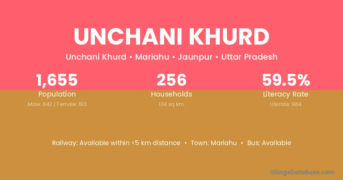 Unchani Khurd village has a total population of 1,655 people, of which 842 are males and 813 are females.