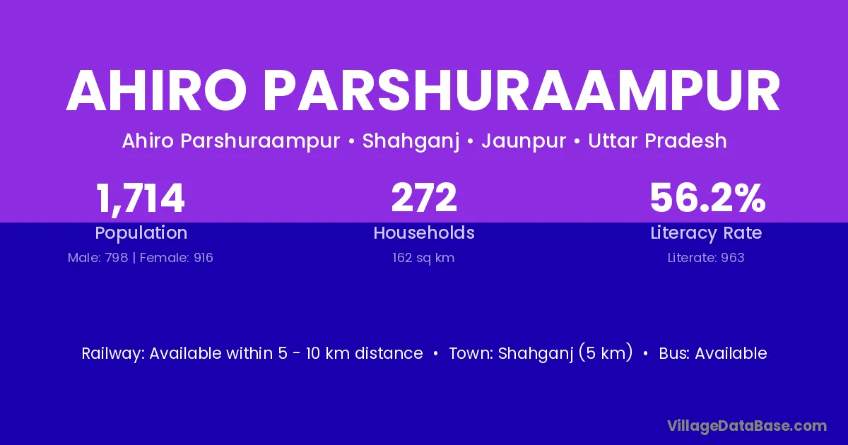Shahganj (5 km) is the nearest town to Ahiro Parshuraampur village for major economic activities and is located approximately 5 km away.