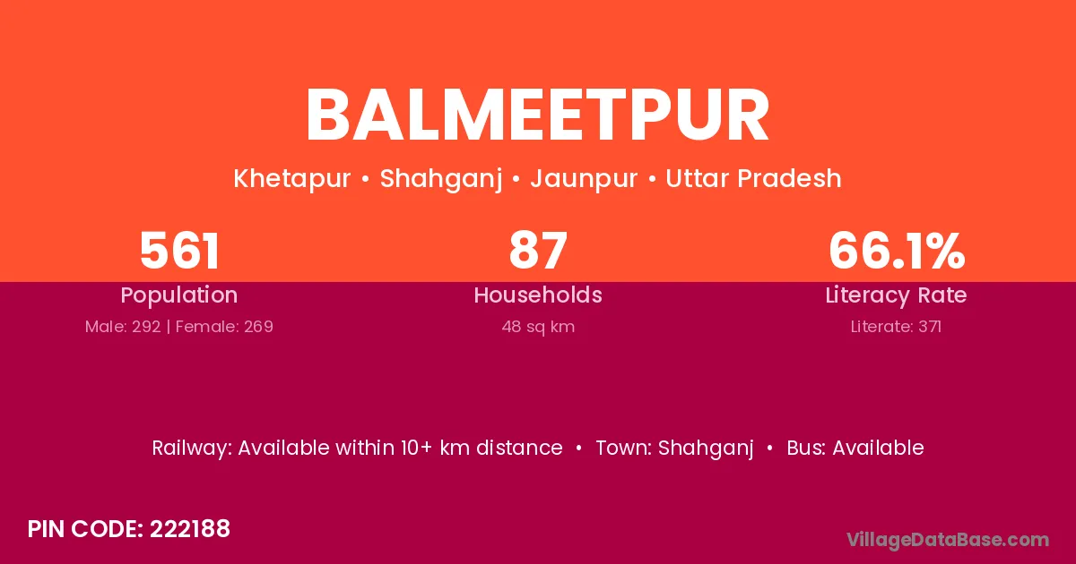 Balmeetpur village has a total population of 561 people, of which 292 are males and 269 are females.