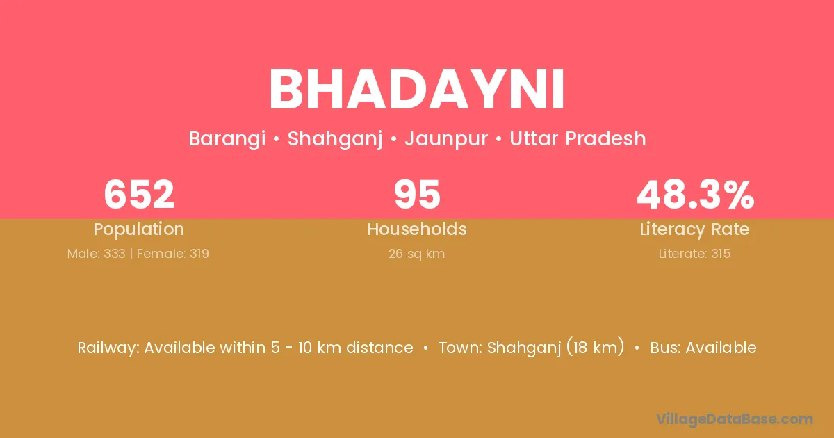 Shahganj (18 km) is the nearest town to Bhadayni village for major economic activities and is located approximately 18 km away.