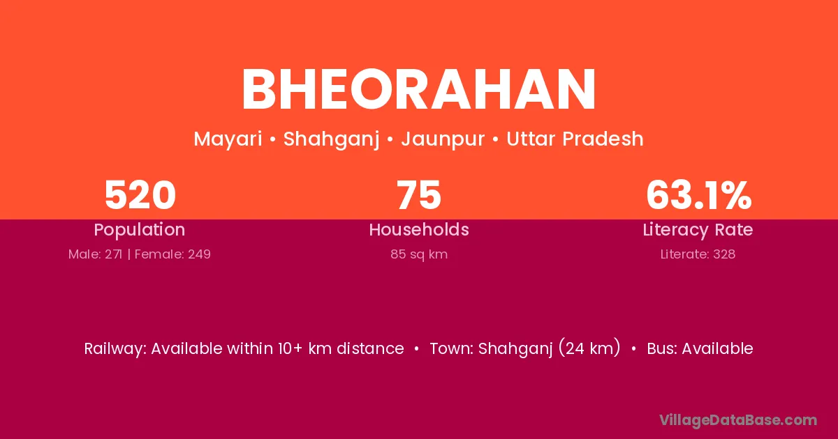 Shahganj (24 km) is the nearest town to Bheorahan village for major economic activities and is located approximately 24 km away.