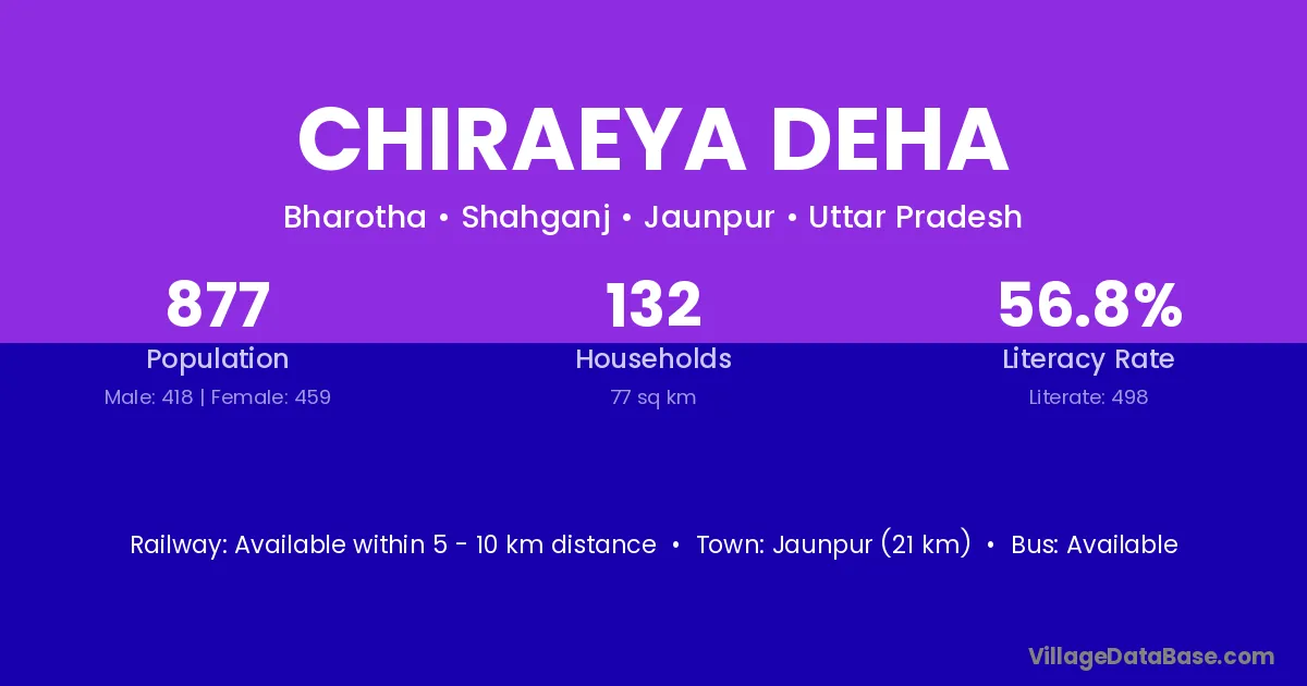 Jaunpur (21 km) is the nearest town to Chiraeya Deha village for major economic activities and is located approximately 21 km away.