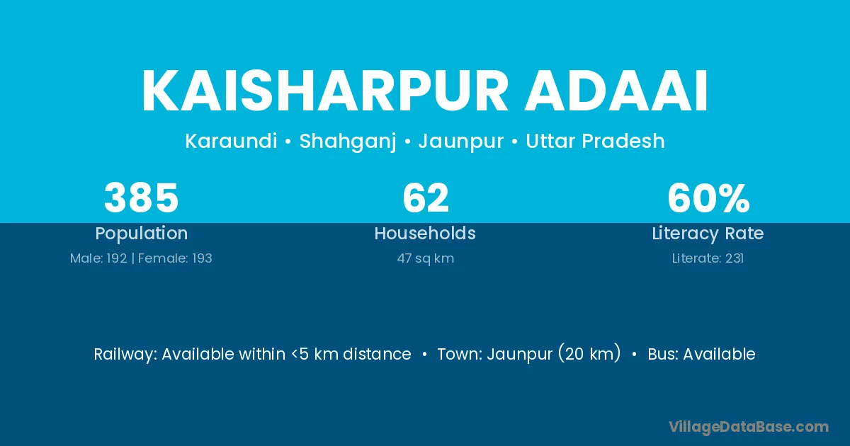 Kaisharpur Adaai village has a total population of 385 people, of which 192 are males and 193 are females.