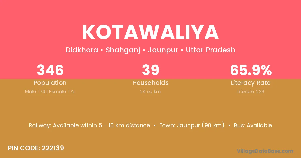 Jaunpur (90 km) is the nearest town to Kotawaliya village for major economic activities and is located approximately 90 km away.