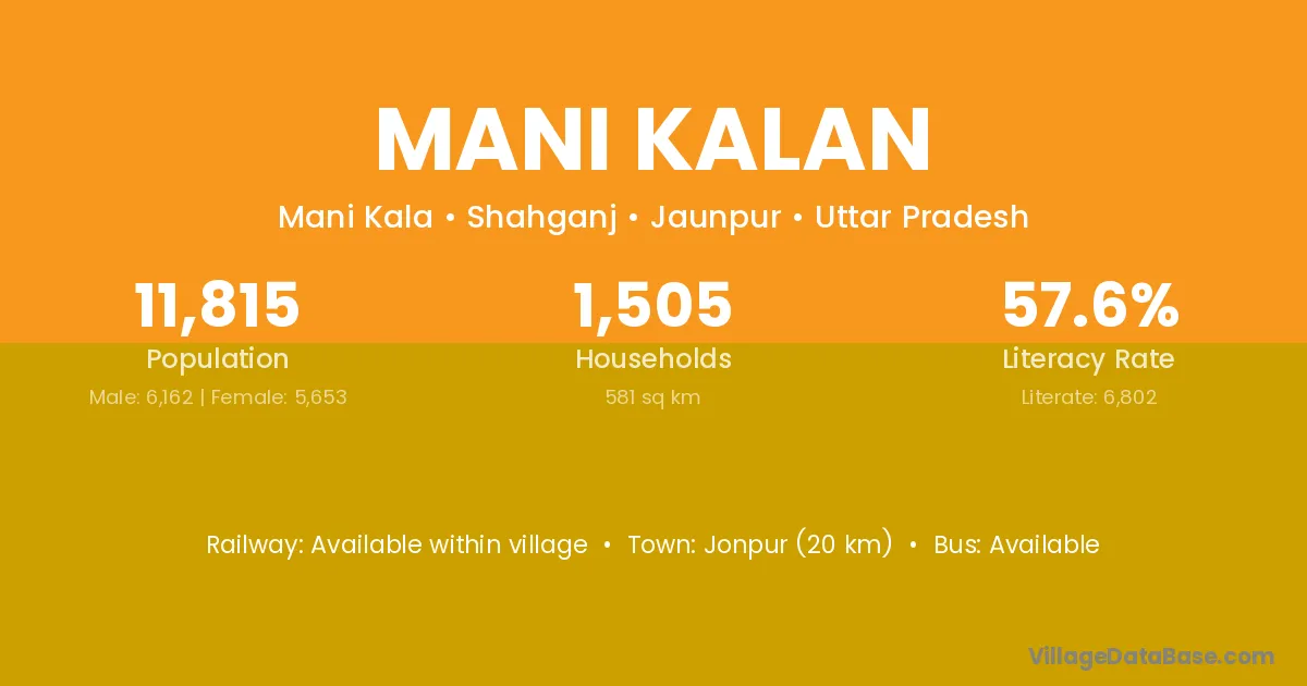Mani Kalan village has a total population of 11,815 people, of which 6,162 are males and 5,653 are females.