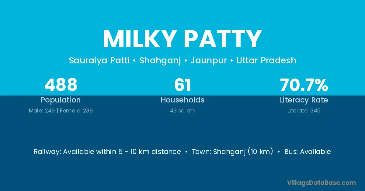 Shahganj (10 km) is the nearest town to Milky Patty village for major economic activities and is located approximately 10 km away.
