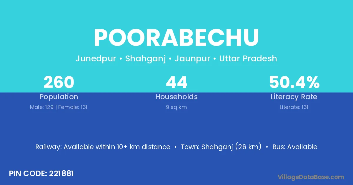 Poorabechu village has a total population of 260 people, of which 129 are males and 131 are females.
