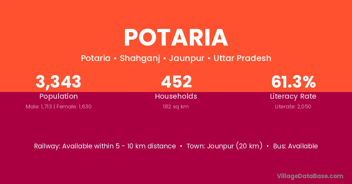 Jounpur (20 km) is the nearest town to Potaria village for major economic activities and is located approximately 20 km away.