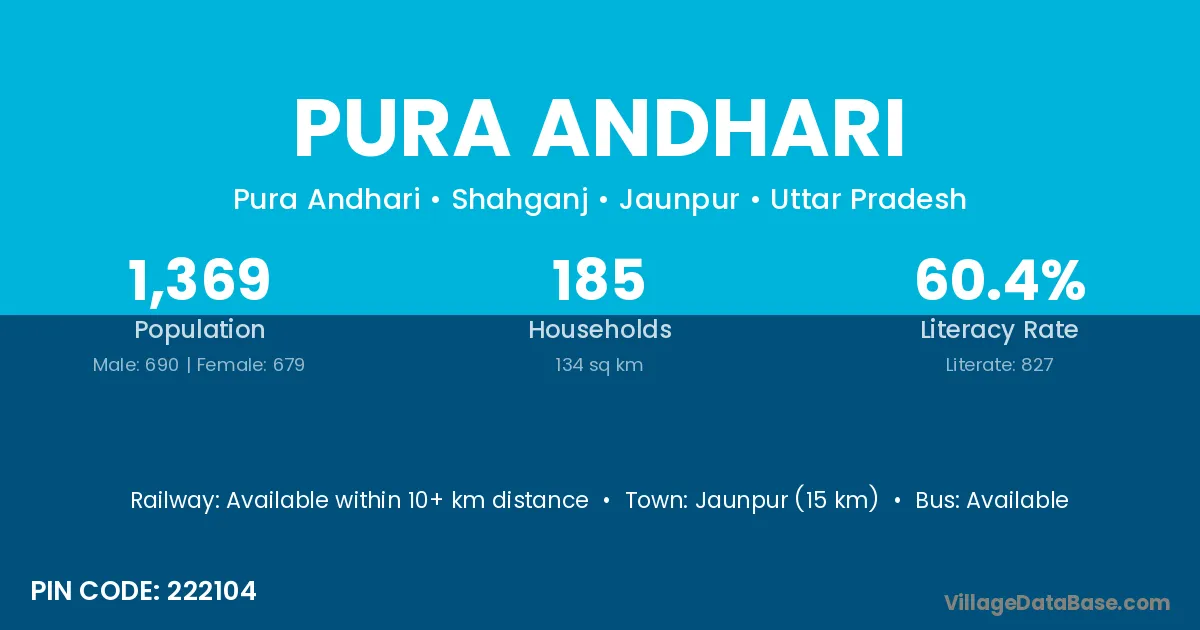 Jaunpur (15 km) is the nearest town to Pura Andhari village for major economic activities and is located approximately 15 km away.