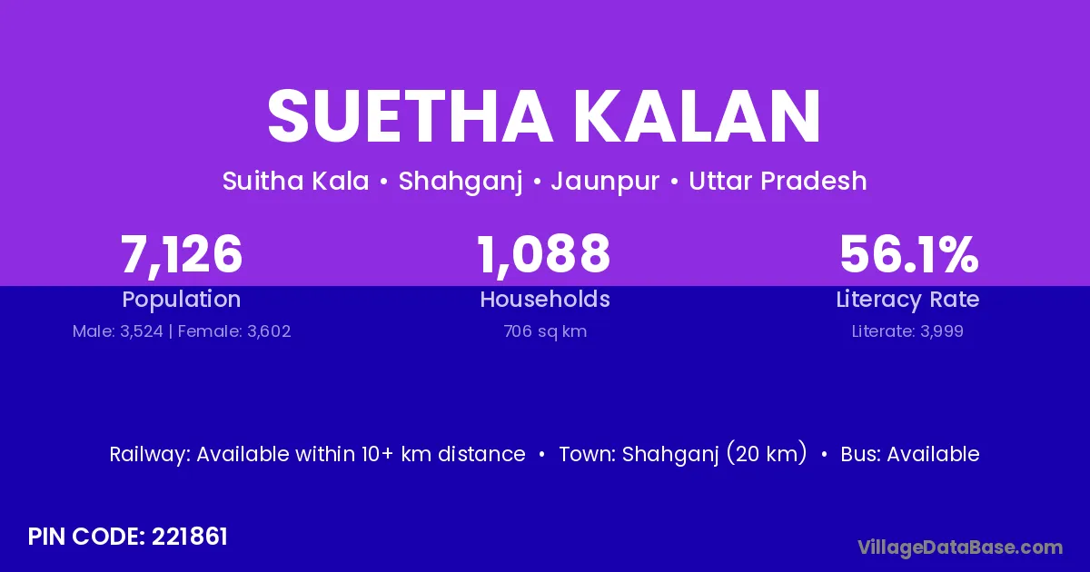 Shahganj (20 km) is the nearest town to Suetha Kalan village for major economic activities and is located approximately 20 km away.