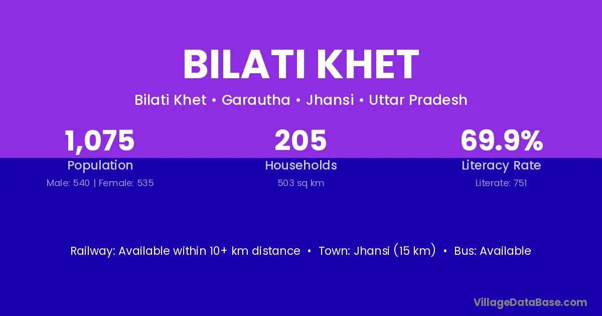 Jhansi (15 km) is the nearest town to Bilati Khet village for major economic activities and is located approximately 15 km away.