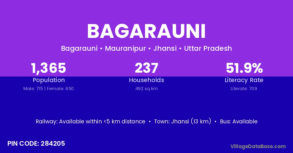 Jhansi (13 km) is the nearest town to Bagarauni village for major economic activities and is located approximately 13 km away.