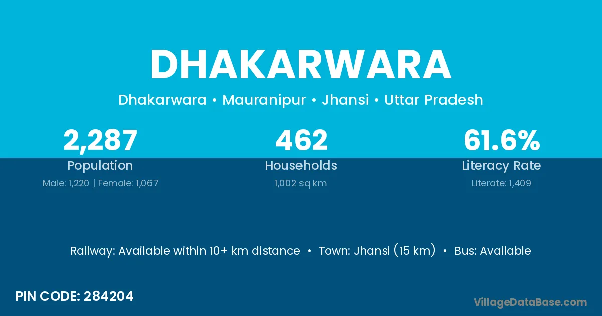Jhansi (15 km) is the nearest town to Dhakarwara village for major economic activities and is located approximately 15 km away.