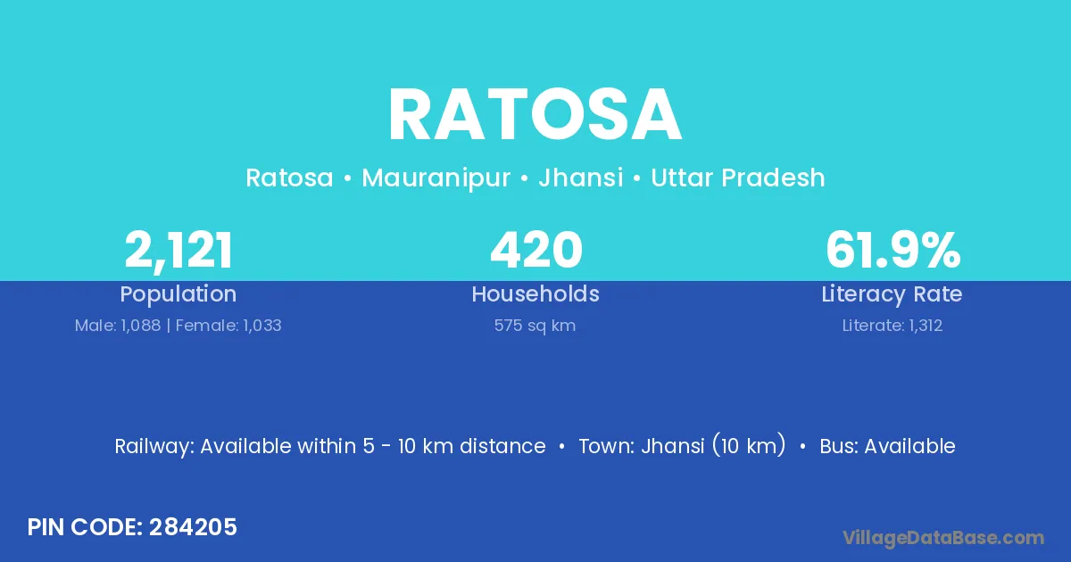 Jhansi (10 km) is the nearest town to Ratosa village for major economic activities and is located approximately 10 km away.