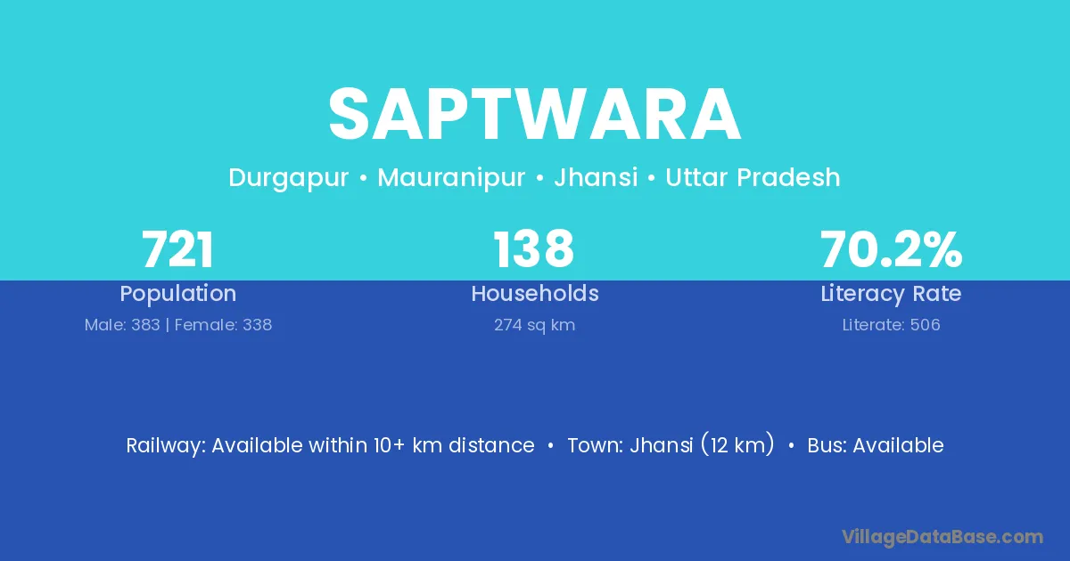 Jhansi (12 km) is the nearest town to Saptwara village for major economic activities and is located approximately 12 km away.