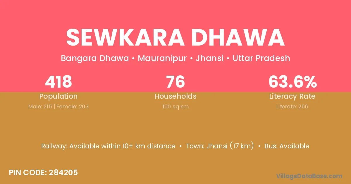 Jhansi (17 km) is the nearest town to Sewkara Dhawa village for major economic activities and is located approximately 17 km away.