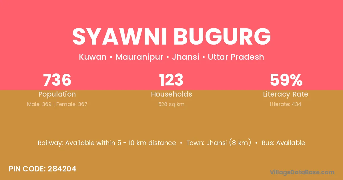 Jhansi (8 km) is the nearest town to Syawni Bugurg village for major economic activities and is located approximately 8 km away.