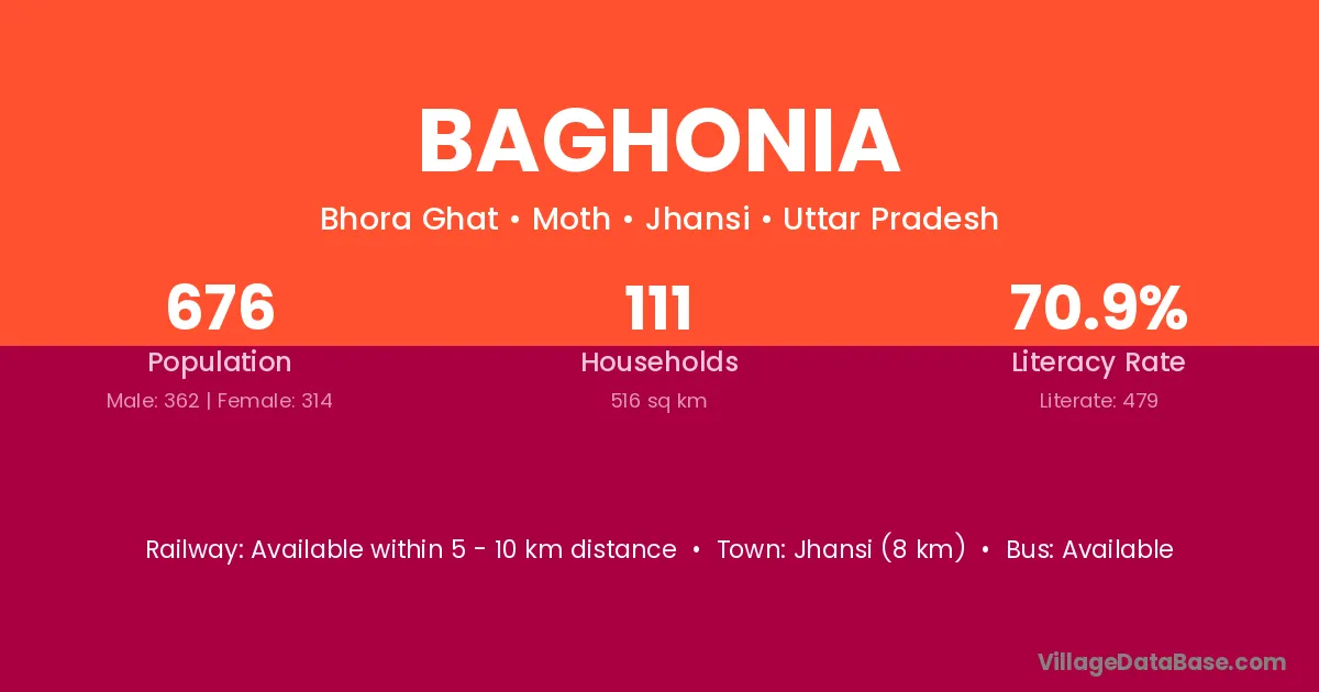 Jhansi (8 km) is the nearest town to Baghonia village for major economic activities and is located approximately 8 km away.