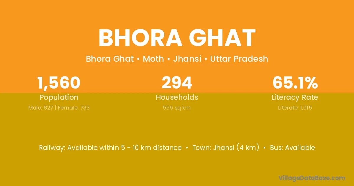 Jhansi (4 km) is the nearest town to Bhora Ghat village for major economic activities and is located approximately 4 km away.