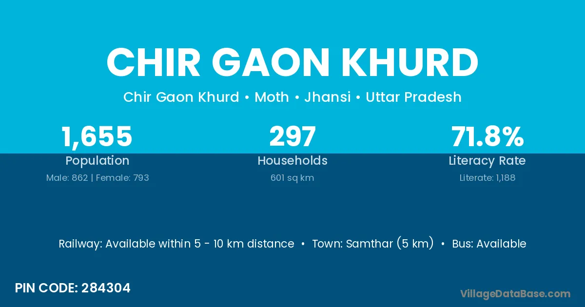 Samthar (5 km) is the nearest town to Chir Gaon Khurd village for major economic activities and is located approximately 5 km away.