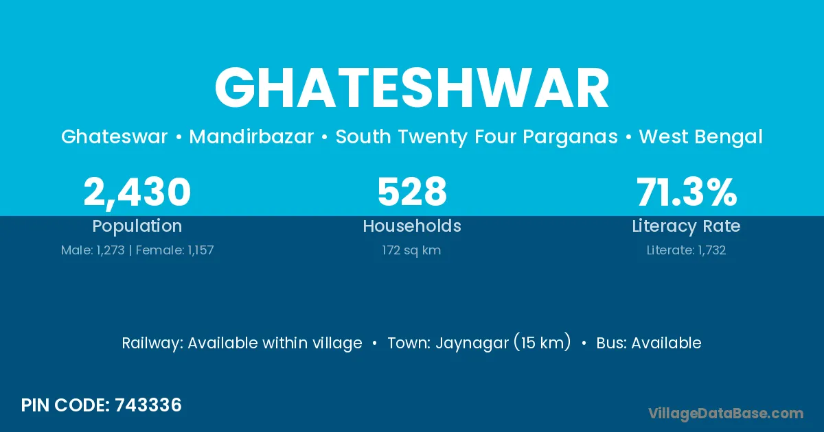 The literacy rate of Ghateshwar village is 12.50%. Male literacy stands at 23.08% and female literacy at 0.00%.