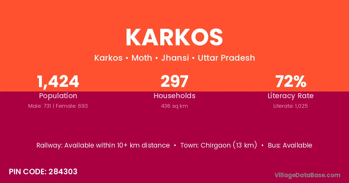 Chirgaon (13 km) is the nearest town to Karkos village for major economic activities and is located approximately 13 km away.