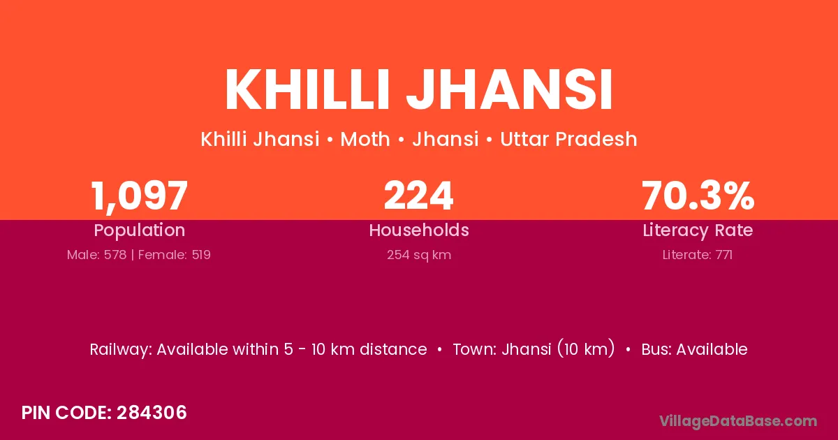 Khilli Jhansi village has a total population of 1,097 people, of which 578 are males and 519 are females.