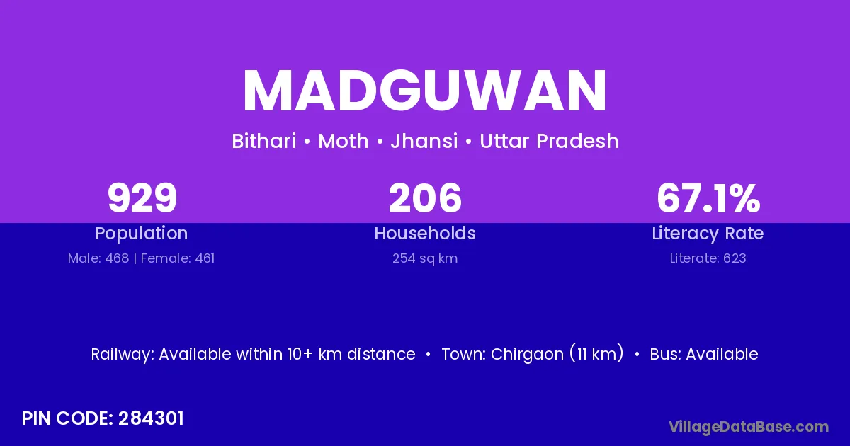 Madguwan village has a total population of 929 people, of which 468 are males and 461 are females.