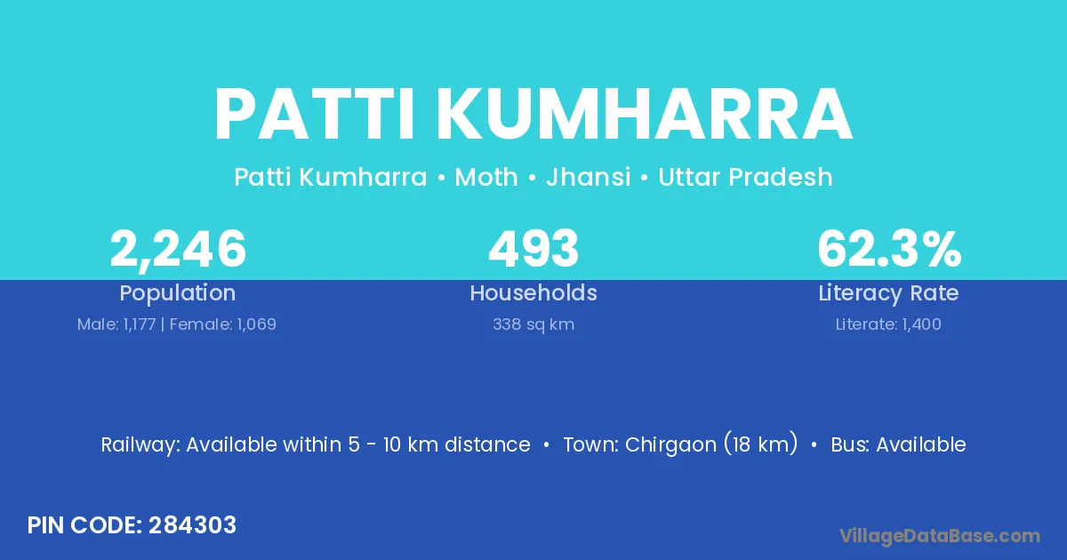 Chirgaon (18 km) is the nearest town to Patti Kumharra village for major economic activities and is located approximately 18 km away.