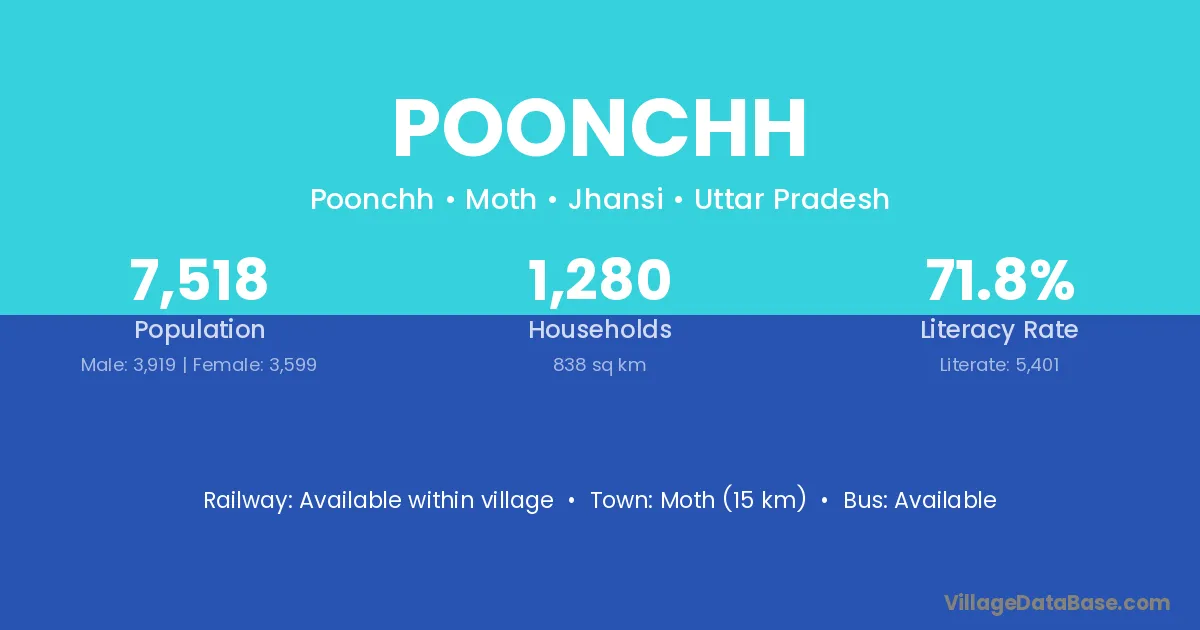 Moth (15 km) is the nearest town to Poonchh village for major economic activities and is located approximately 15 km away.
