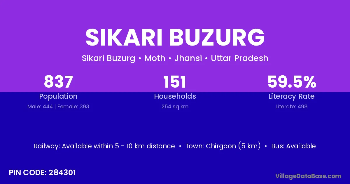 Chirgaon (5 km) is the nearest town to Sikari Buzurg village for major economic activities and is located approximately 5 km away.