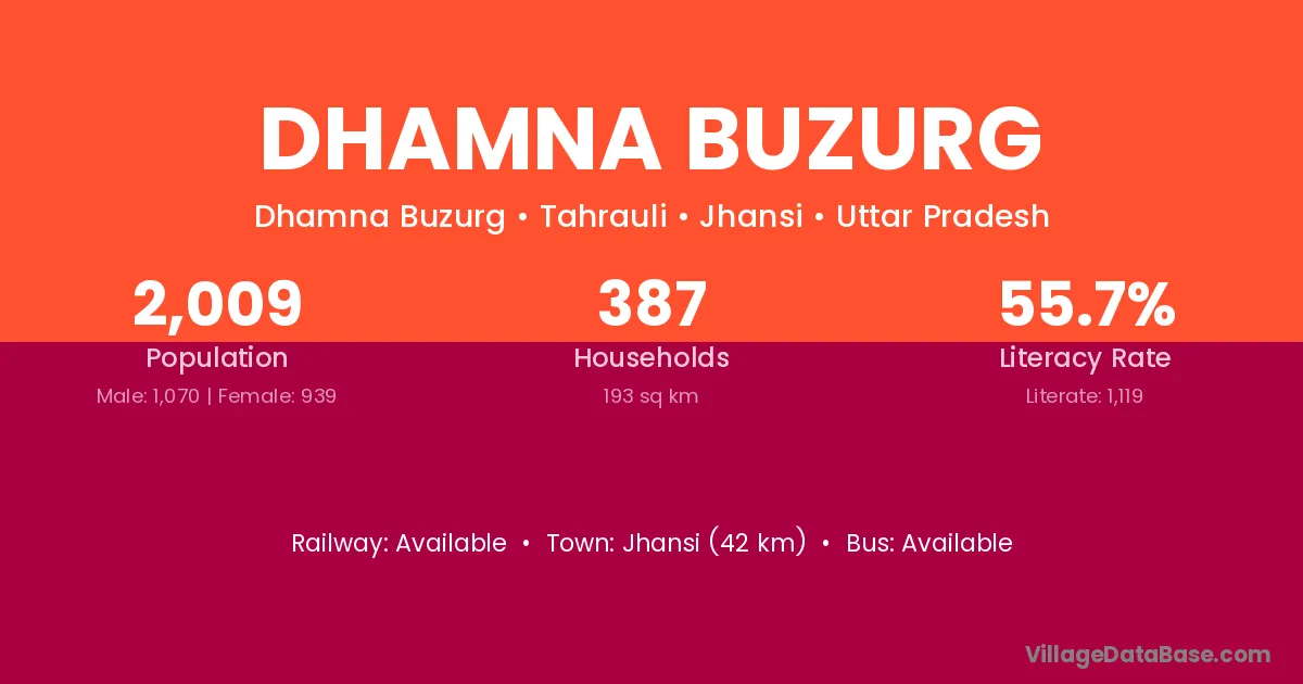 Jhansi (42 km) is the nearest town to Dhamna Buzurg village for major economic activities and is located approximately 42 km away.