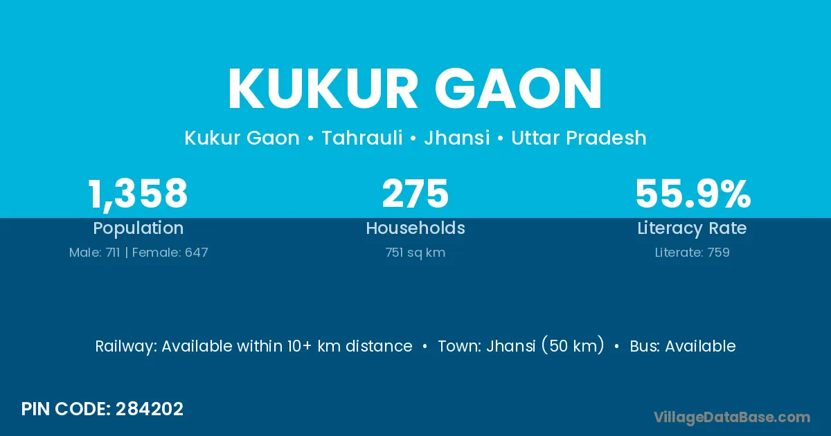 Jhansi (50 km) is the nearest town to Kukur Gaon village for major economic activities and is located approximately 50 km away.