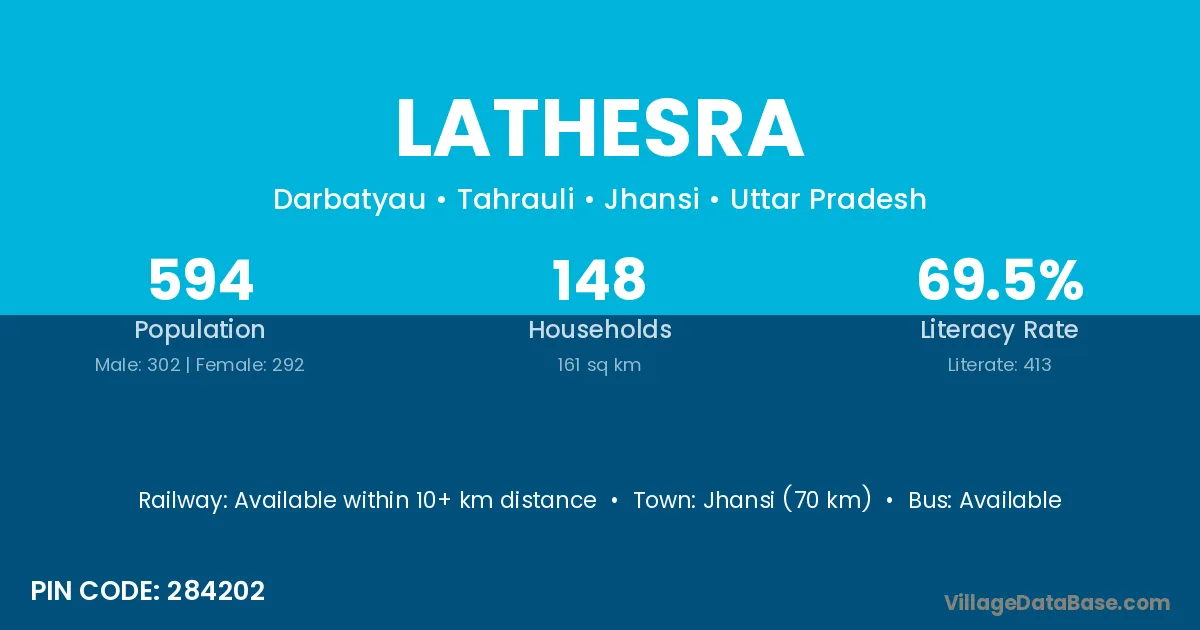 Jhansi (70 km) is the nearest town to Lathesra village for major economic activities and is located approximately 70 km away.