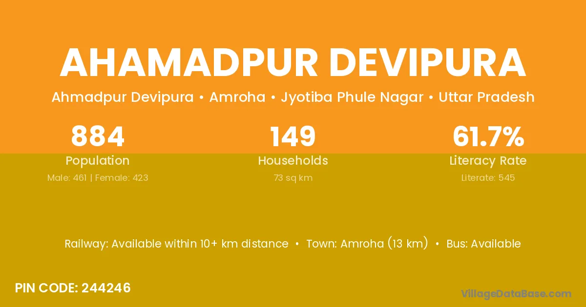 Amroha (13 km) is the nearest town to Ahamadpur Devipura village for major economic activities and is located approximately 13 km away.