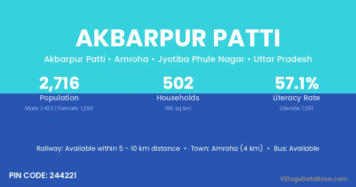 Amroha (4 km) is the nearest town to Akbarpur Patti village for major economic activities and is located approximately 4 km away.