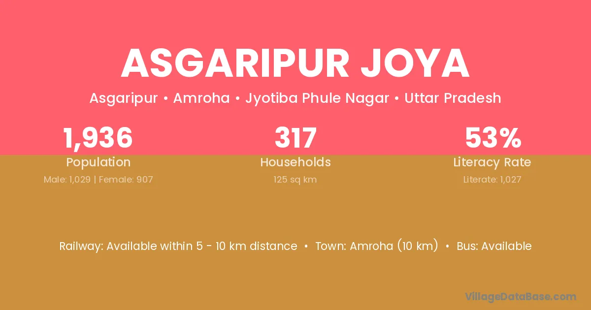 Amroha (10 km) is the nearest town to Asgaripur Joya village for major economic activities and is located approximately 10 km away.