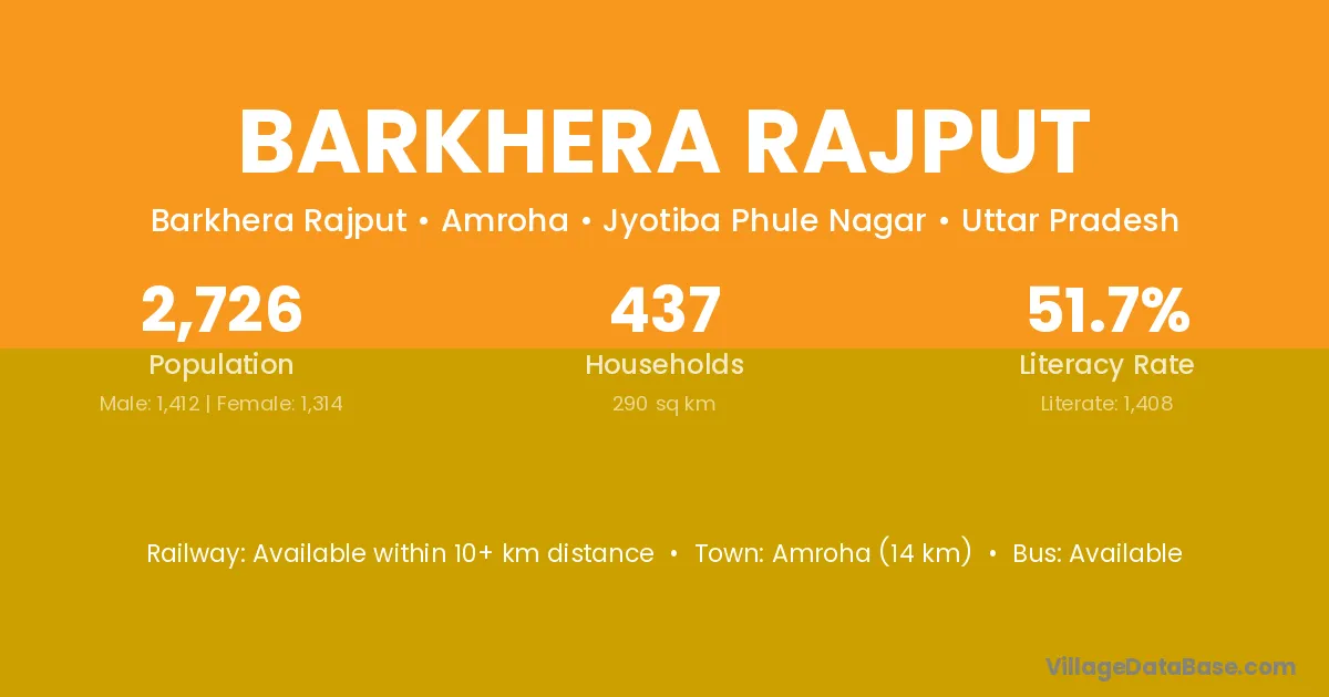 Amroha (14 km) is the nearest town to Barkhera Rajput village for major economic activities and is located approximately 14 km away.