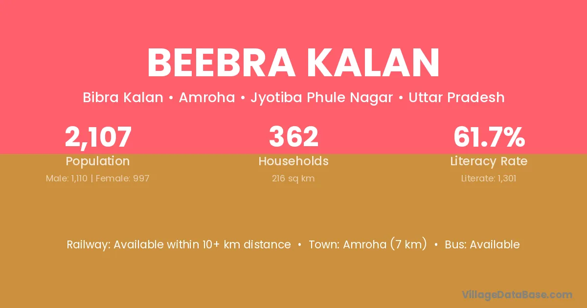 Amroha (7 km) is the nearest town to Beebra Kalan village for major economic activities and is located approximately 7 km away.