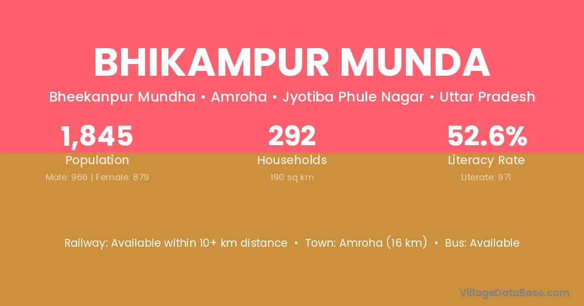 Amroha (16 km) is the nearest town to Bhikampur Munda village for major economic activities and is located approximately 16 km away.