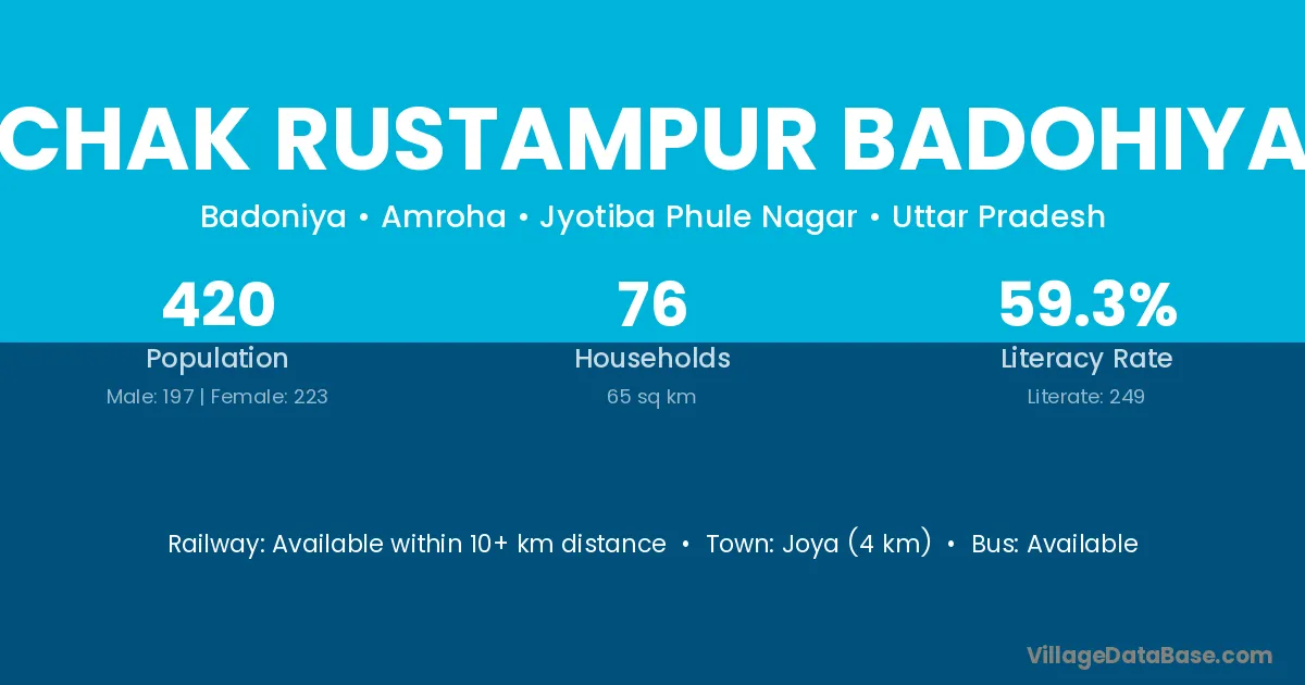 Chak Rustampur Badohiya village has a total population of 420 people, of which 197 are males and 223 are females.